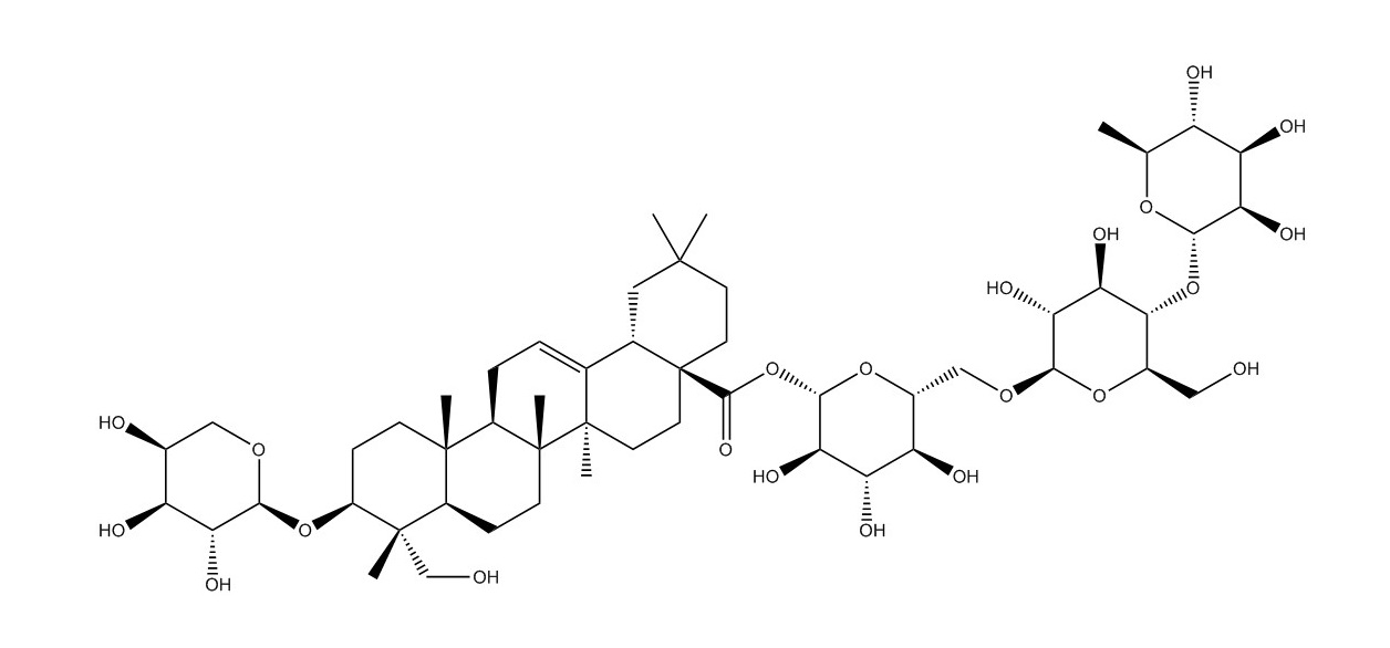 【英文別稱】 3-O-alpha-L-Arabinopyranosylhederagenin 28-O-alpha-L-rhamnopyranosyl-(1->4)-beta-D-glucopyranosyl-(1->6)-beta-D-glucopyranosyl ester