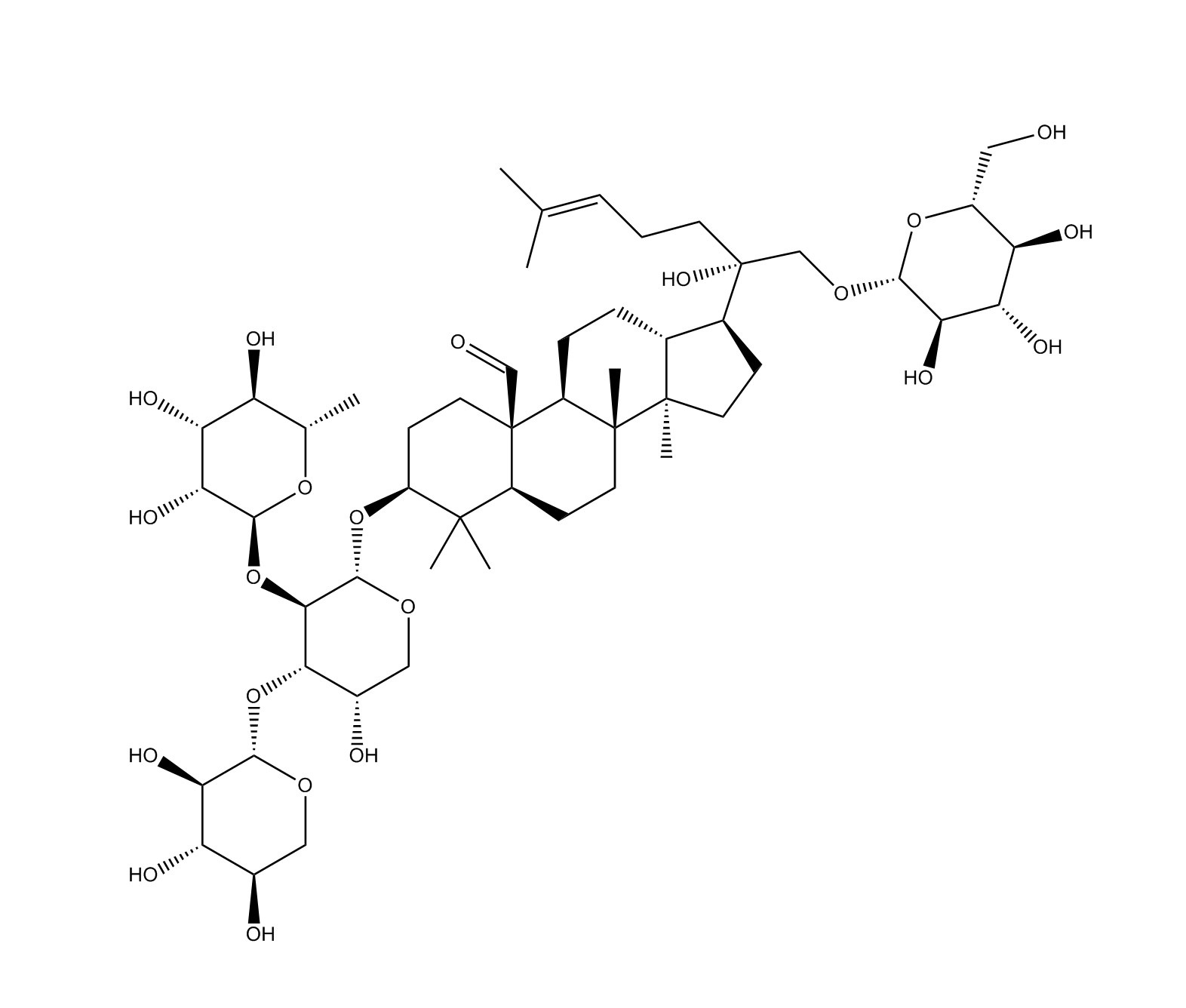 【英文別稱】 (3beta)-3-[(O-6-Deoxy-alpha-L-mannopyranosyl-(1-2)-O-[beta-D-xylopyranosyl-(1-3)]-alpha-L-arabinopyranosyl)oxy]-21-(beta-D-glucopyranosyloxy)-20-hydroxy-dammar-24-en-19-al